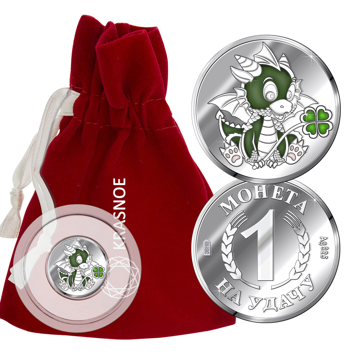 Серебряная монета с зелёной эмалью с изображением Дракона. Символ года.