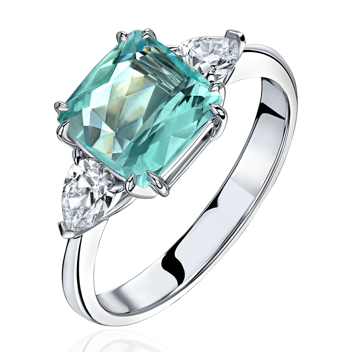 Роскошное женское кольцо из белого золота с турмалином параибой и бриллиантами. Дизайн кольца сосредоточен вокруг турмалина огранки кушон и двух бриллиантов огранки груша. Симбиоз природы и красоты эксклюзивного ювелирного мастерства.