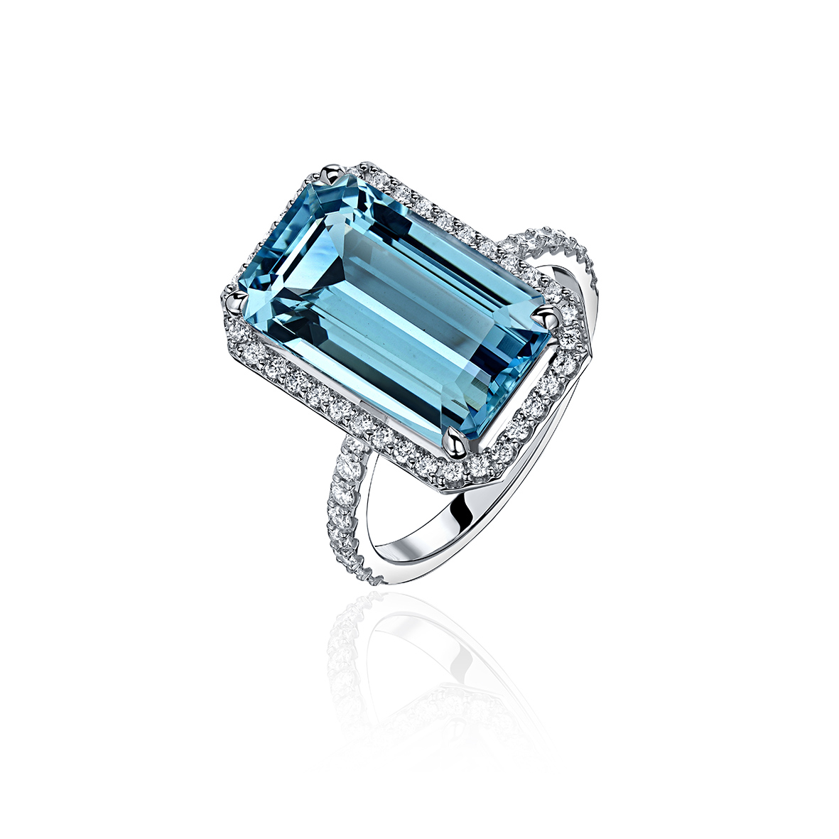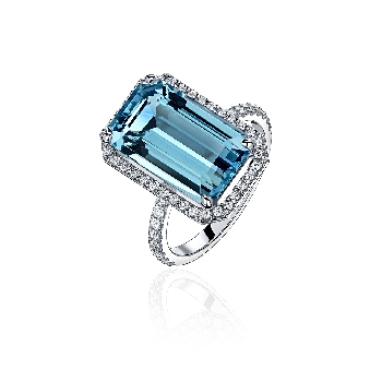 Аквамарин - уже по своему названию ассоциируется со стихией воды. Дословно - морская вода. Огранка формы багет, каст, изящно инкрустированный бриллиантами и такая же элегантная бриллиантовая шинка. Красивейшее кольцо без вычурности.