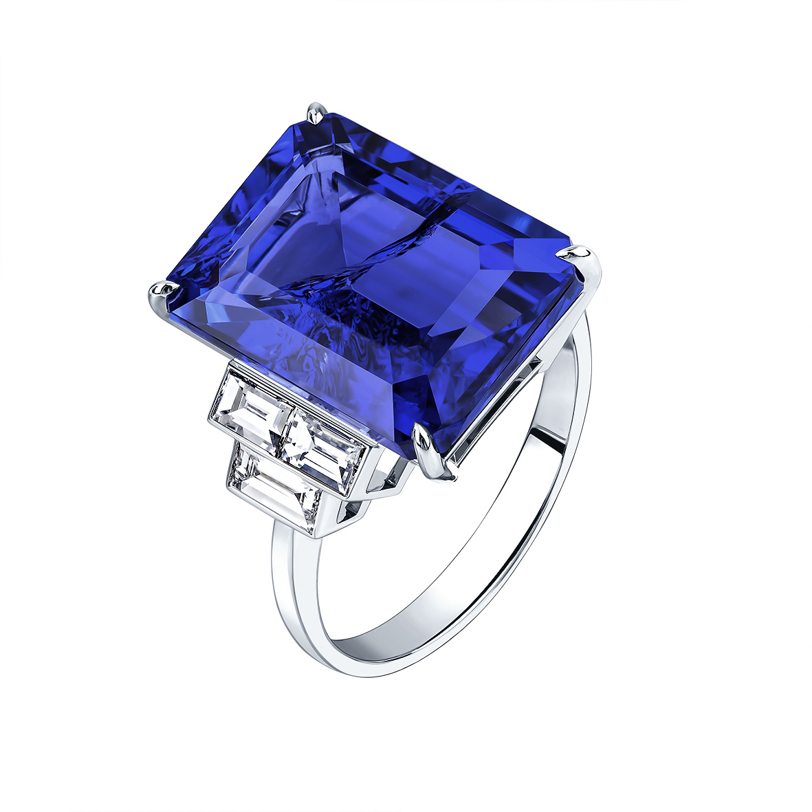 Удивительное кольцо, главным украшением которого выступает крупный экземпляр отменного Танзанита.. Заглядывая в глубину танзанита, словно оказываешься в ледяной сказке, вот уже мороз пронзил изящной стрелой камень в самое его сердце… Визуальный дополнительный объем создан благодаря 4м бриллиантам огранки багет, которые прекрасно подчеркивают зимнюю ассоциацию.