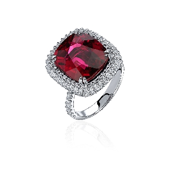 Рубеллит, как главный герой данного кольца, вальяжно расположился на подушке из бриллиантов. Богатое кольцо, ярко заявляющее о своём благородстве и статусе.