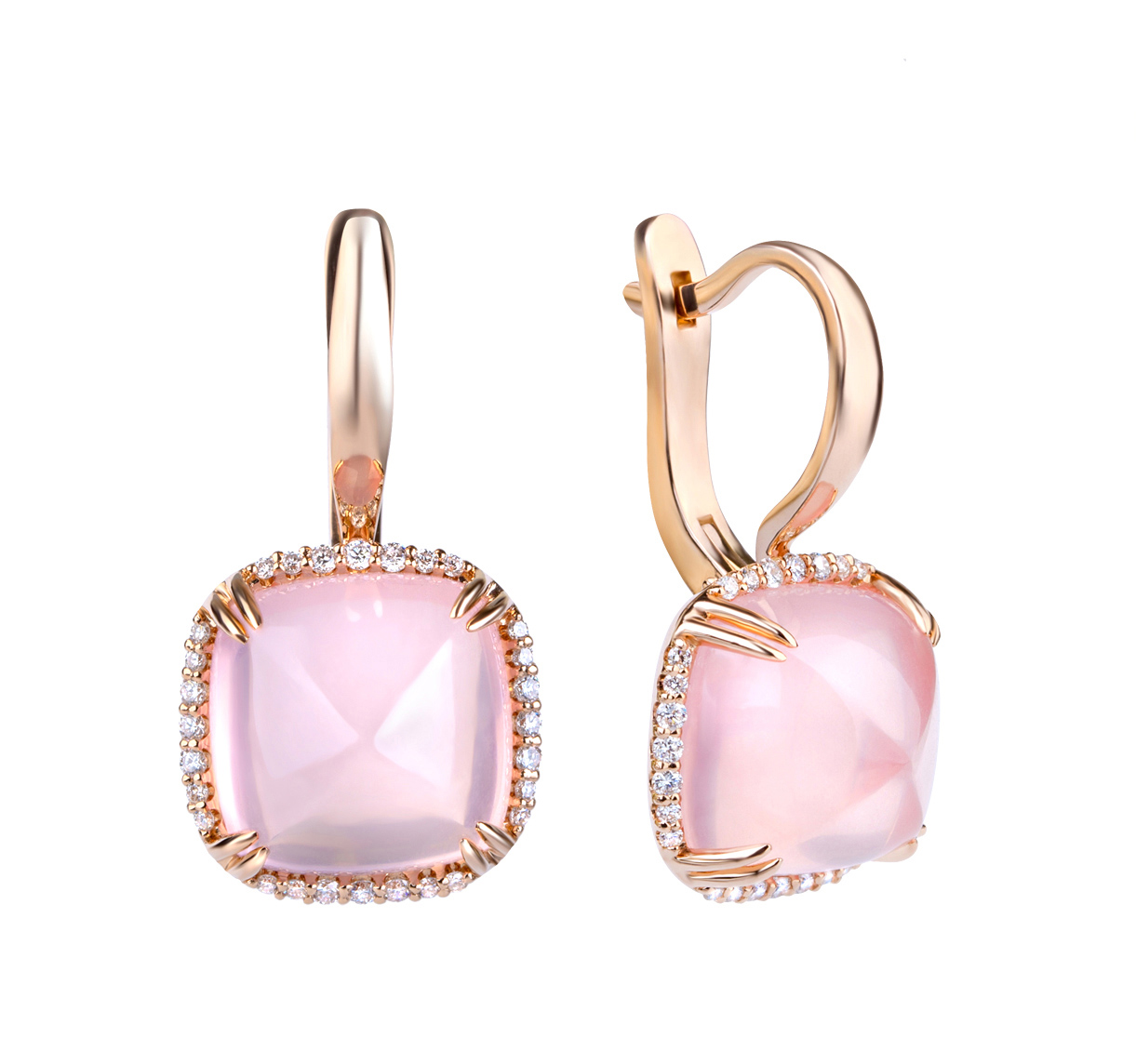 Почти плюшевый комплект с кварцем и бриллиантами. Огранка sugarloaf в сочетании с ярко розовым цветом камней создаёт эффект плюшевости, «мягких подушечек».