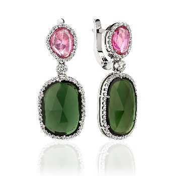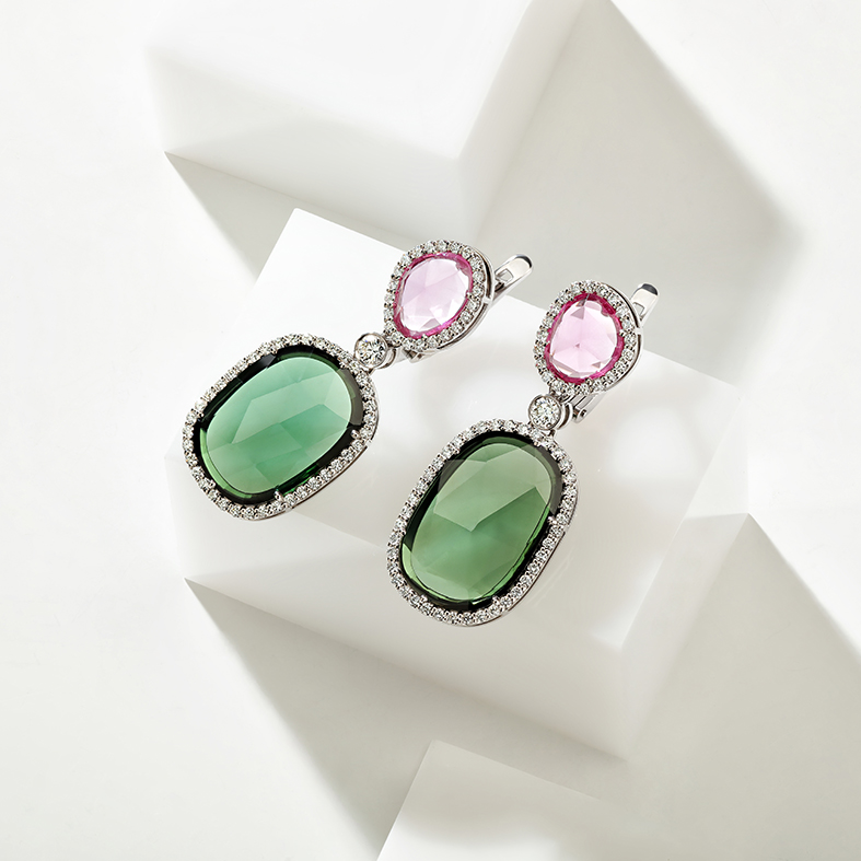 Контрастное сочетание цветов: розового и зелёного, богатая россыпь бриллиантов, крупные камни с лёгкой геометрией.