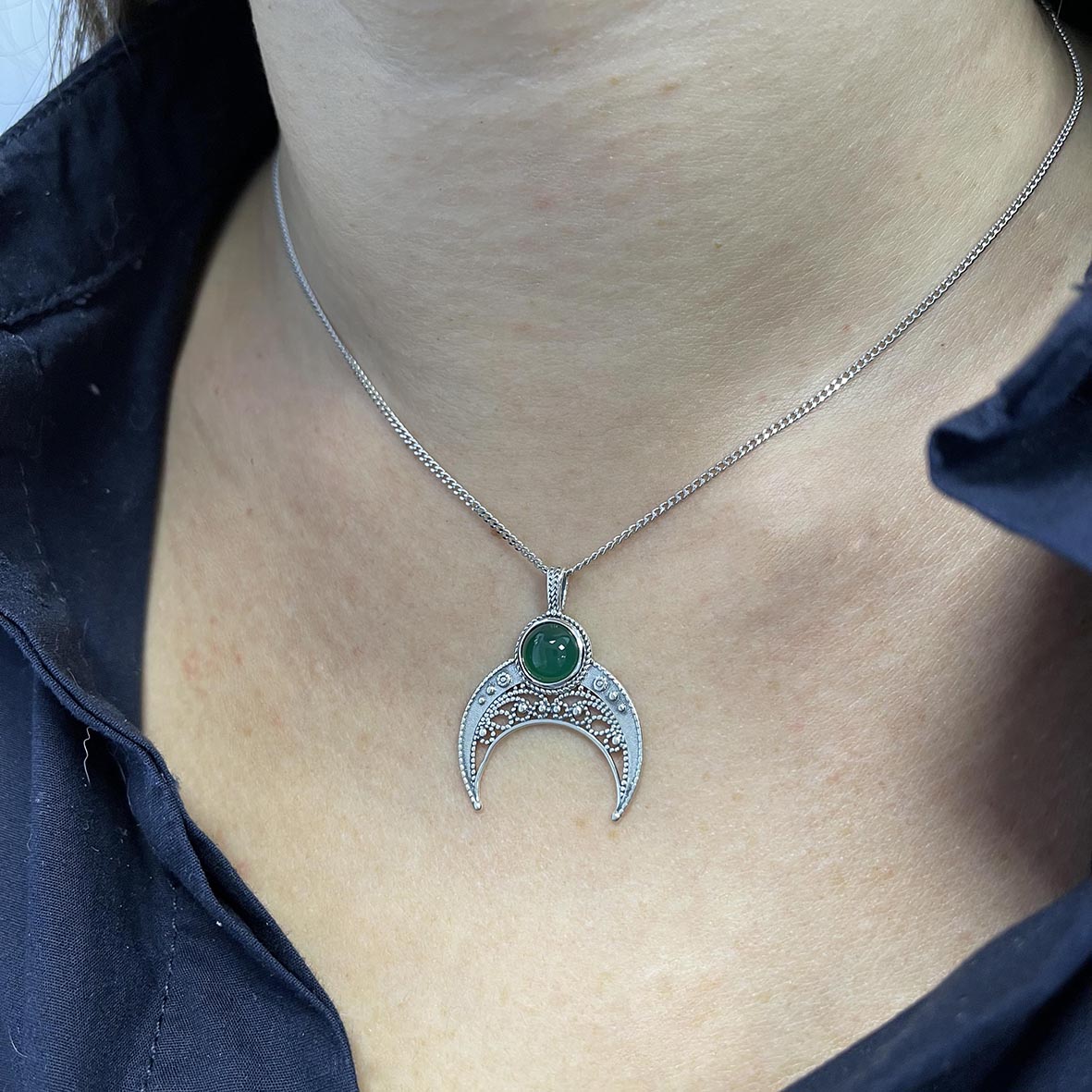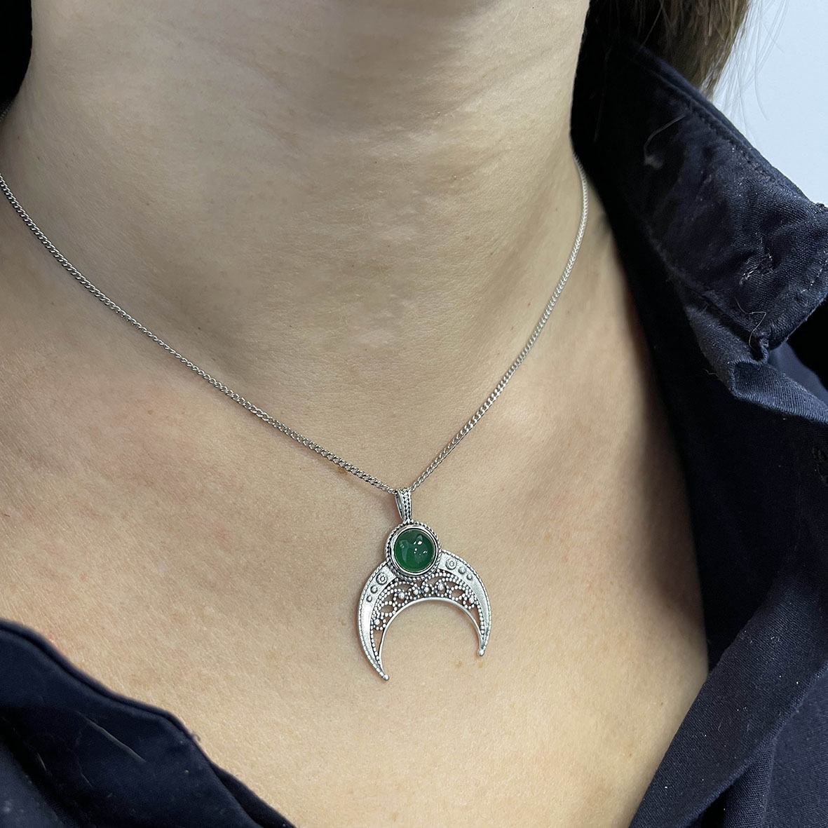 Серебряная подвеска лунница с натуральным зеленым агатом. Подвеска будет отличным вариантом для твоего ювелирного гардероба. Подвеску удобно сочетать с леской или цепочкой так же подойдут для сережек как подвесной элемент. Серебряная подвеска создана для активной жизни. Благодаря лаконичности декоративных решений, изделие можно сочетать с разными образами.KRASNOE нежные и трендовые украшения из серебра 925 собственной разработки, дизайна и производства для красоты твоих будней! В коллекцию ювелирного бренда KRASNOE входят кольца на фалангу, колье - чокеры и галстуки, джекеты. Размер вставки : агат зеленый натуральный 8 мм.